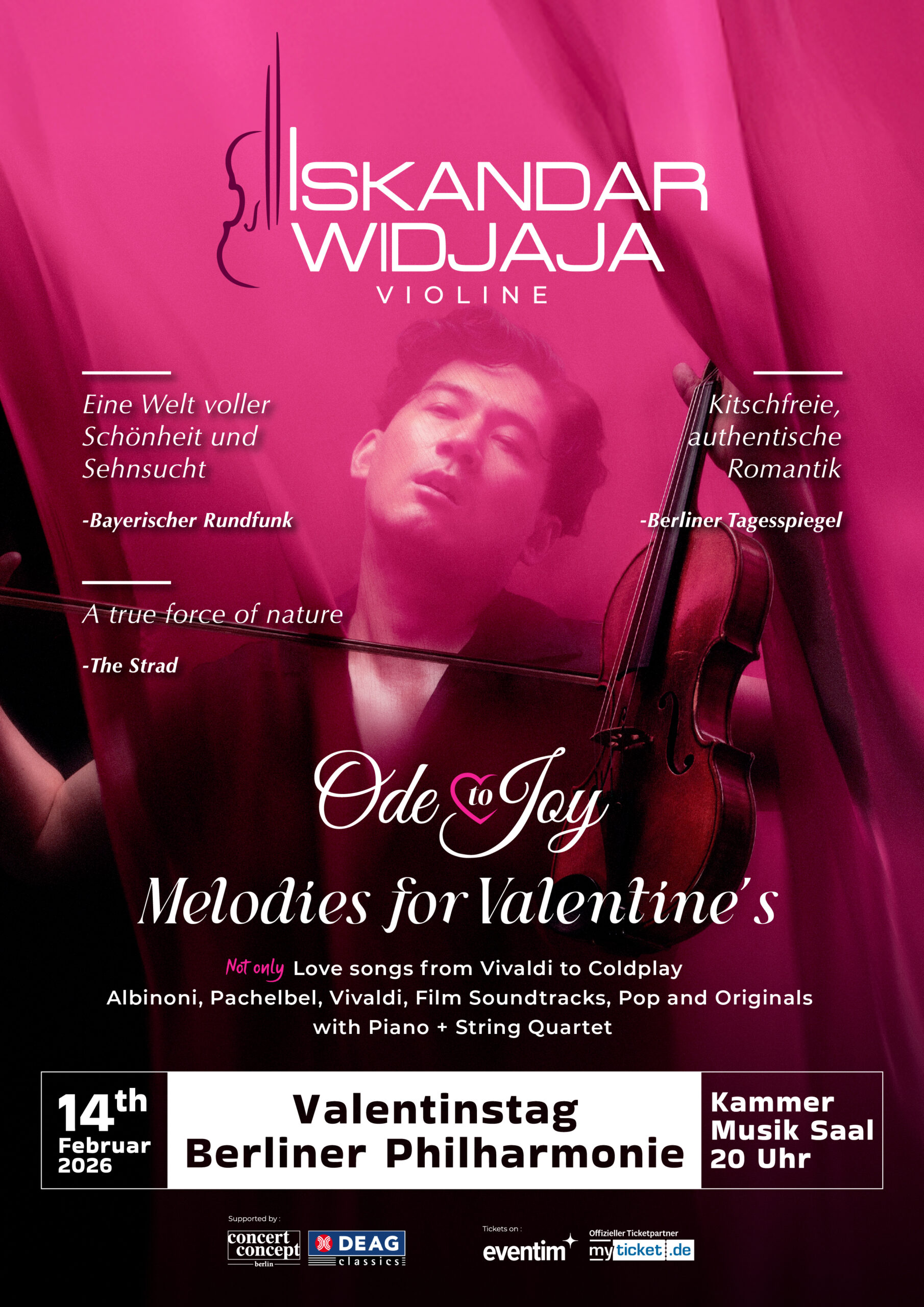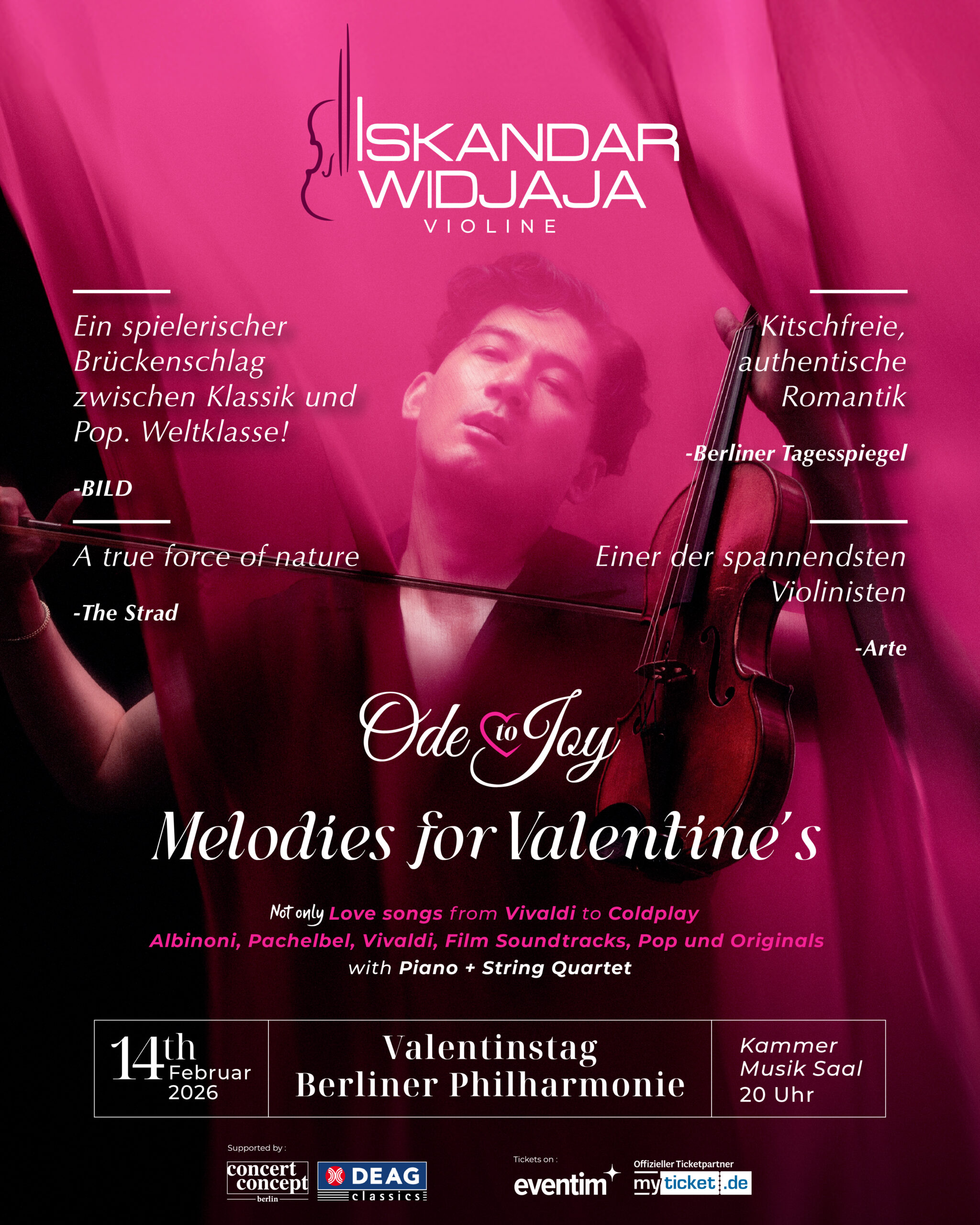 Dieses einmalige Konzert in der Berliner Philharmonie zum Valentinstag bietet ein schwelgerisches Programm, das von den zeitlosen Meisterwerken der Klassik mit Musik von Albinoni, Pachelbel und Vivaldi- frisch und frech neu-interpretiert- bis hin zu Iskandars brandneuem Arrangement reicht: dem COLDPLAY CONCERTO.