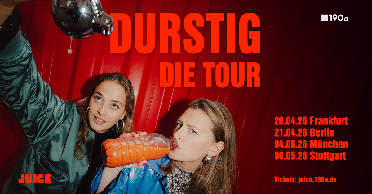 Mit „DURSTIG – Die Tour” bringen Lea und Lina ihren Podcast endlich auf die Bühne. Wer die beiden kennt, weiß: Wenn es irgendwo richtig guten JUICE gibt, dann wird er hier besprochen. Jeden Donnerstag gibt es eine neue Folge mit einer echten, juicy Geschichte aus ihrer Community.
